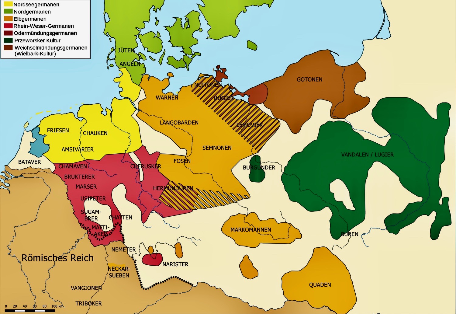 Die folgende Karte gibt einen Überblick zu der möglichen Verteilung der germanischen Stämme im Jahr 100 (Quelle: Von Karl Udo Gerth - Eigenes Werk, Gemeinfrei, https://commons.wikimedia.org/w/index.php?curid=5819588)